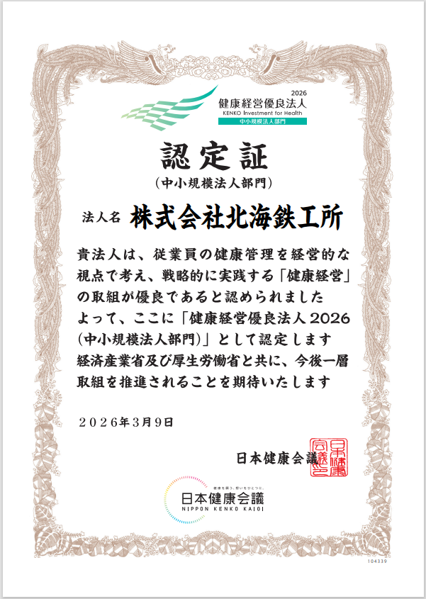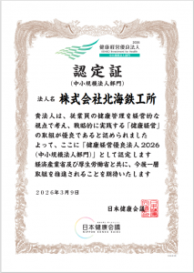 北海鉄工所 2026.4.01 健康経営優良法人2026に認定されました 2026年4月1日 当社は、経済産業省および日本健康会議が推進する「健康経営優良法人認定制度」において、本年度も「健康経営優良法人」として認定されましたことをお知らせいたします。 また、当社では新たに「すこやかプロジェクト」を発足いたしました。 本プロジェクトは、社員一人ひとりの健康と安心を守るとともに、組織の生産性向上および持続的な成長の実現を目的としています。 初年度は、「運動」「朝食」「睡眠」「禁煙」の4つの施策を重点テーマとして、全社的に取り組んでまいります。