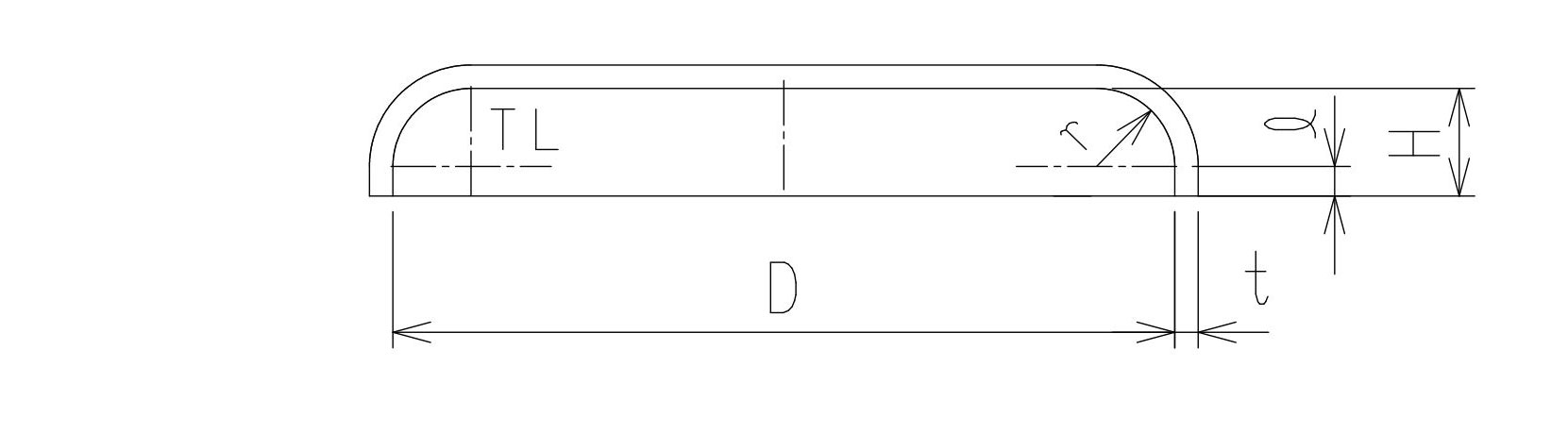 D:内径 / R:中央部の内半径 / r:すみの丸みの内半径 / t:厚さ / ℓ:フランジ部長さ / H:高さ / TL:タンジェントライン / α:角度