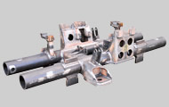 台車は乗客等を乗せた車体を、下から支持しながら軌道上を円滑に遂行するという重要な役割があります。台車は台車枠といわれる、上から見てH型のフレーム構造をしており、レールと並行となる両側の2本の側梁と側梁をつなぐ横梁で構成されています。側梁・横梁とも安全確保上きわめて重要な強度部材であるといえます。弊社では、特殊プレス技術により、高品質なこれらの台車部品を生産し、各車両メーカー様に安心をお届けしています。